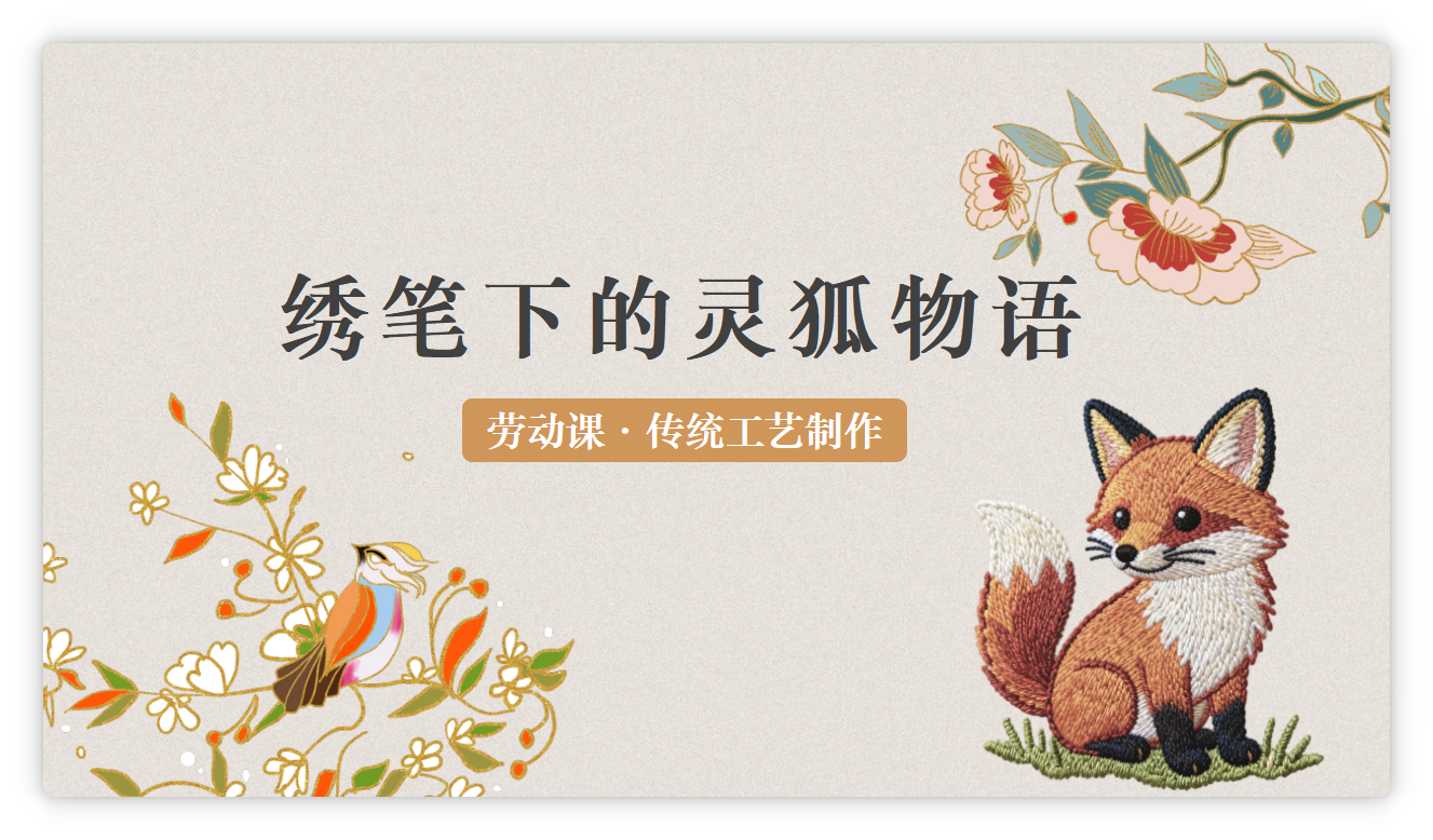 本节课的劳动意义在于传承中国刺绣这一古老民间工艺,让学生在一针一线中感受传统文化的温度与魅力;通过手部精细操作,锻炼学生的手眼协调能力与专注力;引导学生观察狐狸的形态特征,培养观察力与想象力,在创作中体会劳动的快乐与价值,树立保护传统文化、热爱手工劳动的意识。